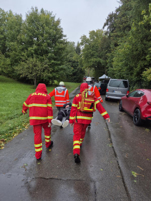 Währenddessen retteten die Feuerwehr Neuffen und der Gefahrstoffzug Nürtingen die verunglückten Personen aus dem Gefahrenbereich. Insgesamt waren rund 50 Statisten sowie 9 Feuerwehrfahrzeuge, 3 Fahrzeuge des DRK und 5 Mitglieder der DLRG Neuffen-Beuren an der Übung beteiligt.