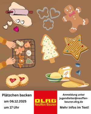 Im November laden wir alle kleinen Bäcker herzlich zum Plätzchenbacken ein! Gemeinsam wollen wir Teig kneten, Plätzchen ausstechen und verzieren – und natürlich die ersten leckeren Weihnachtskekse naschen. Bitte teilt uns bei der Anmeldung eventuelle Allergien mit, damit wir Rücksicht nehmen können. Meldet euch schnell an und seid dabei! Los geht’s am Donnerstag den 06.11.2025 um 17:00 Uhr im Bürgerhaus Beuren. Bitte meldet euch bis zum 02.11.2025 mit Name und Alter unter folgender Mail an Jugendleiter@neuffen-beuren.dlrg.de Wir freuen uns über viele Anmeldungen.