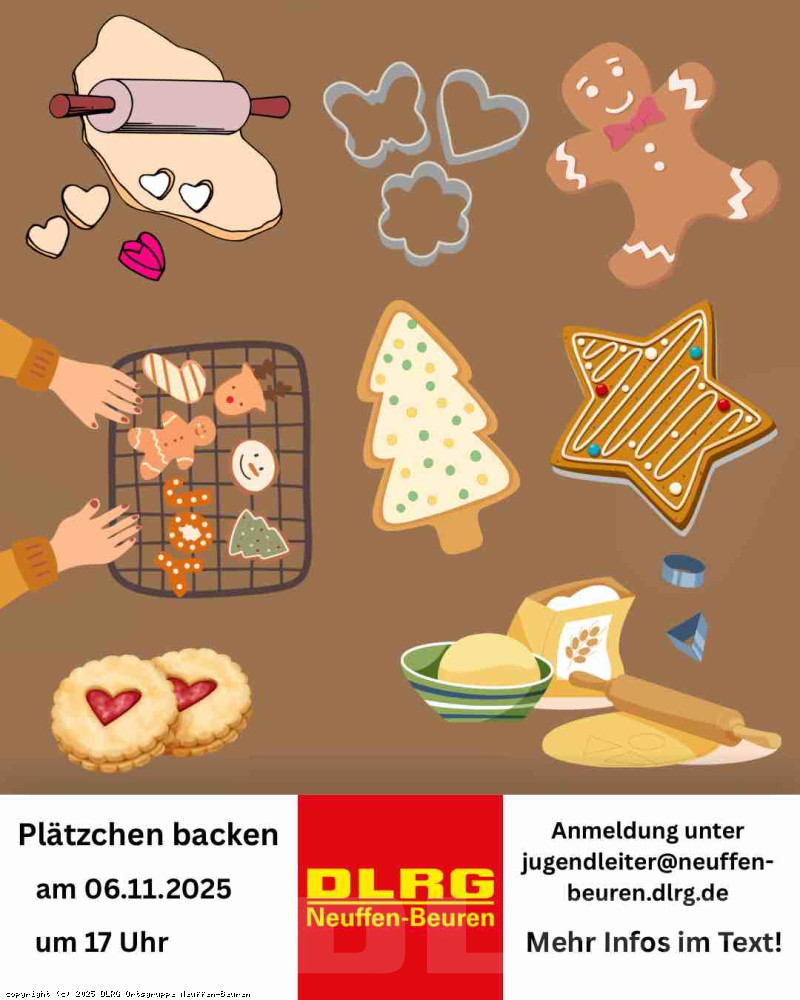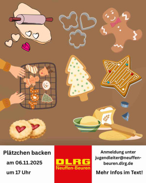 Im November laden wir alle kleinen Bäcker herzlich zum Plätzchenbacken ein! Gemeinsam wollen wir Teig kneten, Plätzchen ausstechen und verzieren – und natürlich die ersten leckeren Weihnachtskekse naschen. Bitte teilt uns bei der Anmeldung eventuelle Allergien mit, damit wir Rücksicht nehmen können. Meldet euch schnell an und seid dabei! Los geht’s am Donnerstag den 06.11.2025 um 17:00 Uhr im Bürgerhaus Beuren. Bitte meldet euch bis zum 02.11.2025 mit Name und Alter unter folgender Mail an Jugendleiter@neuffen-beuren.dlrg.de Wir freuen uns über viele Anmeldungen.
